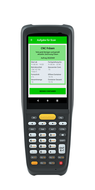 Scannen Sie den Code eines Arbeitsplatzes oder einer Anlage, so zeigt es Ihnen den aktuell laufenden oder anstehenden Arbeitsauftrag für diese Station.